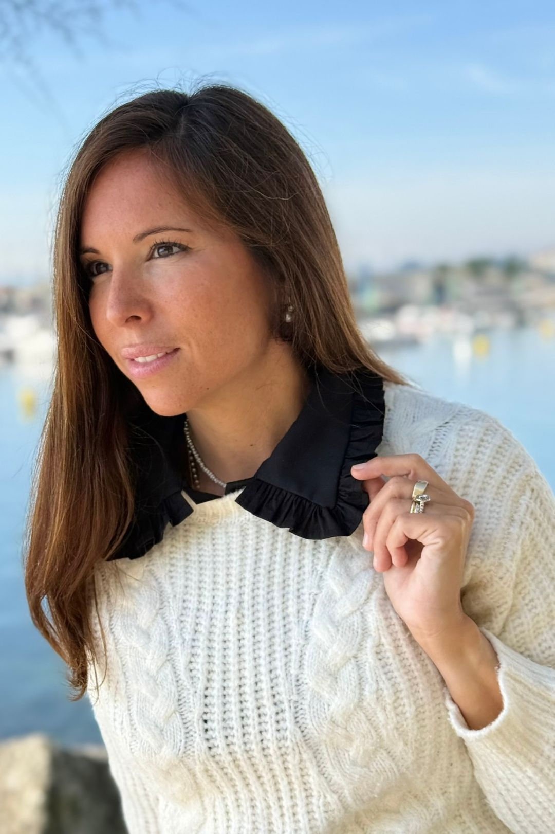 Cuello fabricado en tela 100% algodón de color negra, con botonadura delantera y acabado en pico con volante en el borde, perfecto para todo tipo de ocasión. Es cómodo y práctico, con ajuste debajo de los brazos para que no se mueva. Está diseñado y confeccionado en España con materiales 100% algodón. Combina con cualquier prenda de tu armario. Es un complemento ideal y versátil. Disponible en 5 colores, unidades limitadas.